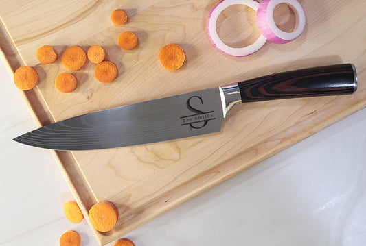 Elevate your culinary game with our custom engraved professional stainless steel chef knife. With a durable and stylish pakka wood handle, this knife is designed for precision and comfort. Add a personal touch with custom engraving and stand out in the kitchen. Expertly crafted for any kitchen enthusiast.