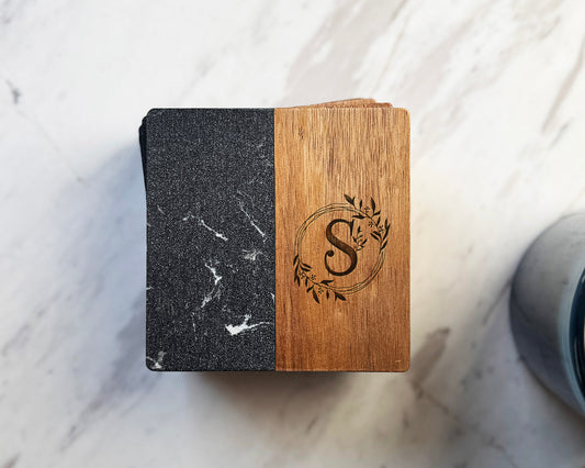 Personalized Black Marble & Acacia Charcuterie Board Set with Custom Floral Monogram