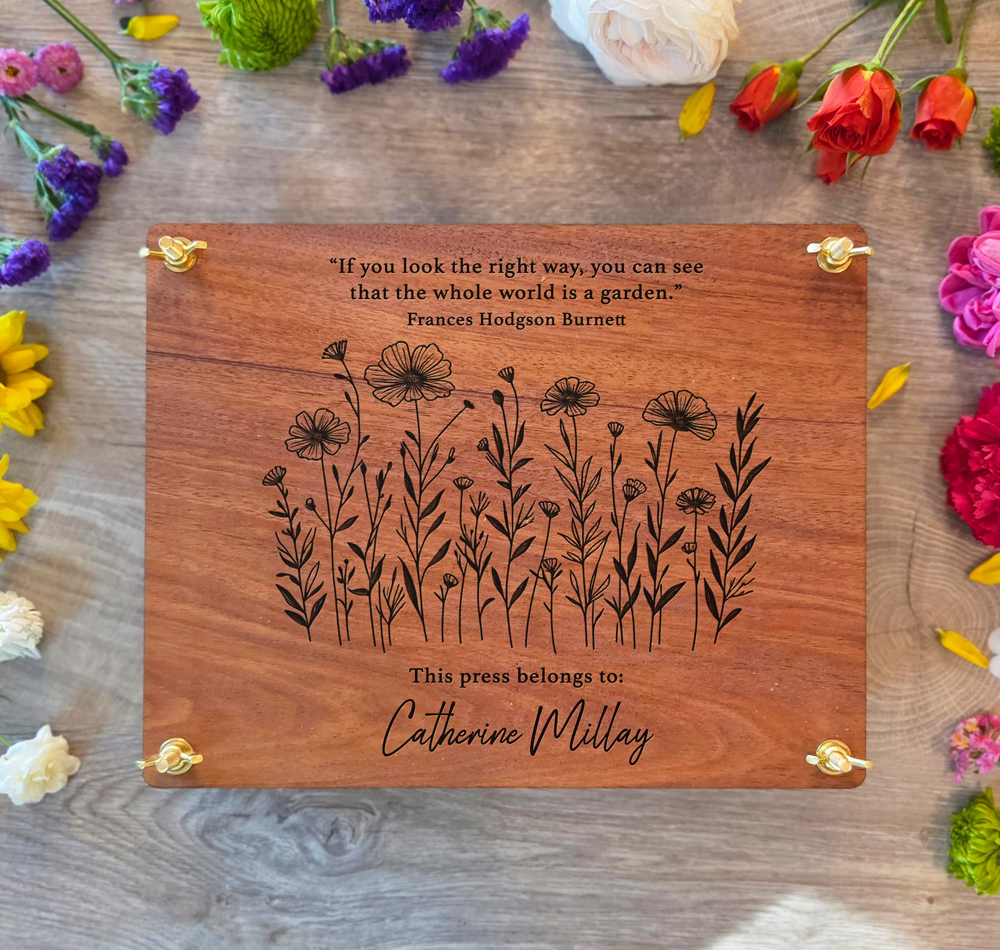 Capture nature's beauty and create timeless keepsakes with our custom wooden flower press. This heirloom-quality botanical press, personalized with a name, makes a truly unique gift for gardeners, crafters, or nature lovers.