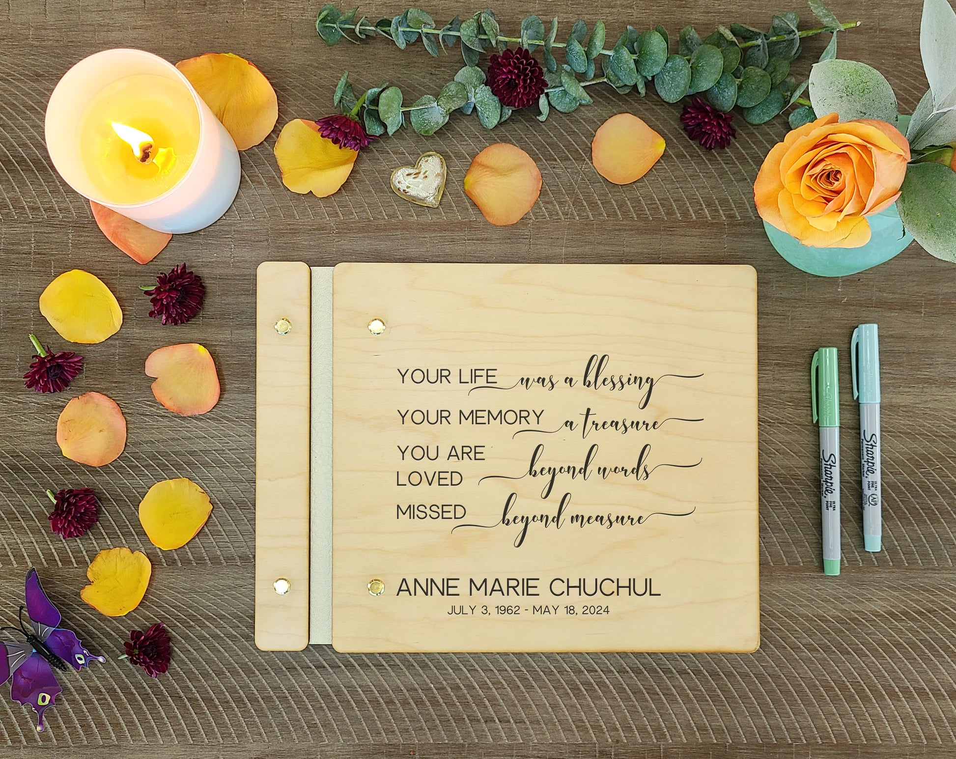 Honor the memory of your loved one with this beautiful personalized wooden guest book. Guests will fill the pages with their memories, condolences, and words of comfort during the celebration of life ceremony. We hand-create these lovely guest books with care to become a cherished keepsake for the family.🍃